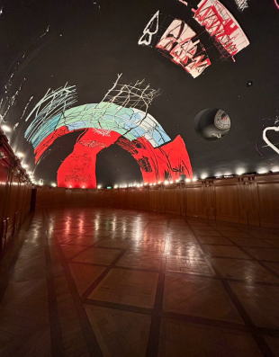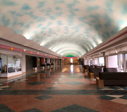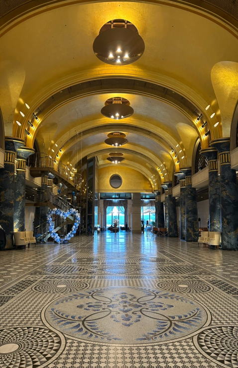 ロビーに入ると ヨーロッパの世界遺産にでも来たような光景が目の前に広がります。輝く、天井のドームです。 |