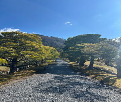 あぜ道だった道路は立派な松並木の道になり離宮をつないでいます。伝統ある古い家を |