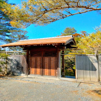 杮葺きの屋根と花菱紋の透かし彫りが施してある坂戸の御幸門から下離宮に入ります。 |
