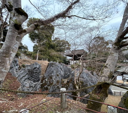 見ごたえのある天然記念物 硅灰石、 奥には多宝塔(国宝) |