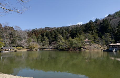 離宮内で最も高い位置にある隣雲亭からは、小川をせき止めて作られた浴龍池と呼ばれる大きな池や、その背後に広がる |