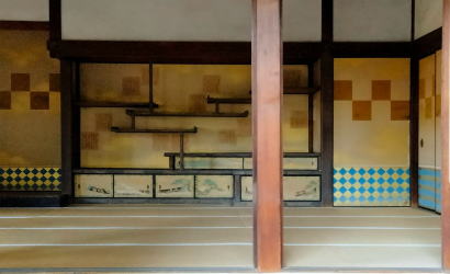 | 霞棚と呼ばれ。戸袋には更紗模様、地袋には友禅染、引き手は羽子板の形、 女性のお住まいらしい華やかさが表れています |