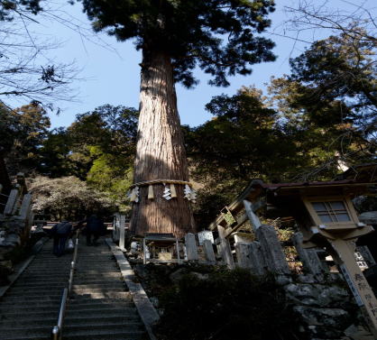 大変な階段が続きます。横には素晴らしい御神木 杖を借りて、手すりを持ってやっと登ります |