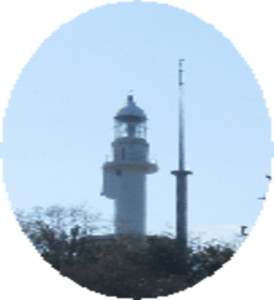 そこから歩いて山の上まで行きますと大きな灯台が立っておりました。海の中にも灯台が立っていました。 |