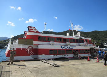 厳原港13:00発 ジェツトフォル壱岐芦辺港に向かいました。船内は満席でした。約1時間のクルージングです。 |