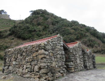 対馬でしか見られない珍しい建築物。板状の石の屋根を葺いた高床式の倉庫です。 |