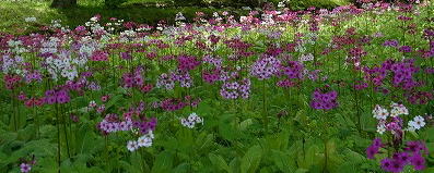 群生をしていてとても綺麗です。水の畔に咲いている色とりどりのクリン草、心が洗われます。 |
