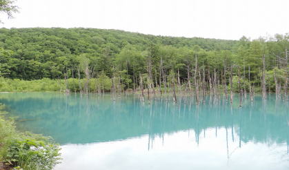 | 枯れた木々が、青色の水辺の上にそびえ立つ、幻想的な風景で有名な「青い池」は人造の池です。 | ||