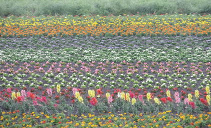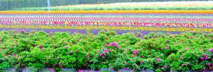 | 美瑛では約7万平方メートルの花畑、十勝岳連峰や丘風景を背に30種の花が咲いています。 | ||