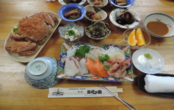 | 最北端の宿 部屋も広く貸し切り状態でした。ここも素晴しい夕食でした。毛カニも丸ごと出て | ||
