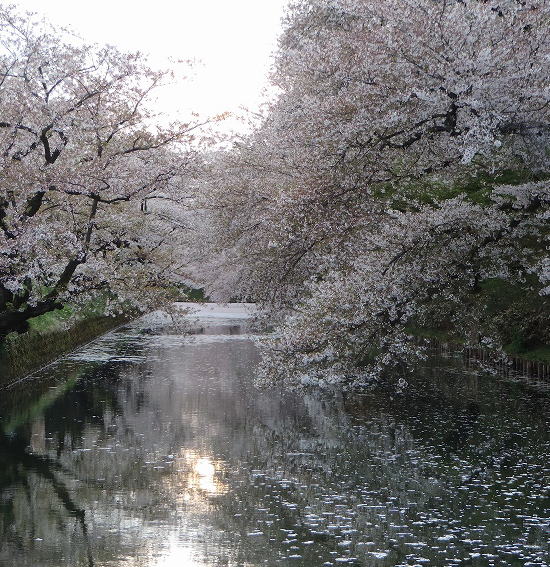 満開の桜、堀がピンク色に変わります。花筏がとても綺麗です。水の中をゆらゆらと流れていきます。 |