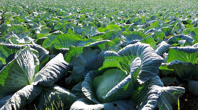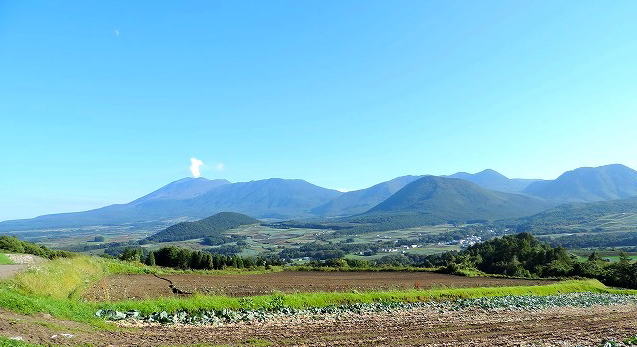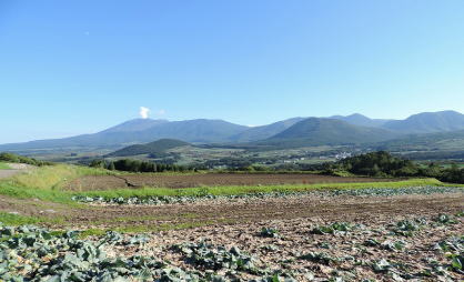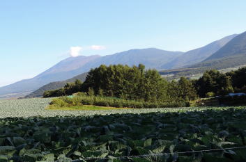 雄大なキャベツ畑は素晴しい景観です。浅間の山は噴煙が出ています。キャベツ畑に囲まれた道路を通ります。 |
