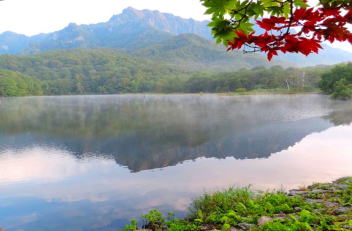 森の中にたたずむ静かな池です。良く晴れておりました。池面に周囲の戸隠連山を映し出されてとても綺麗でした。 |
