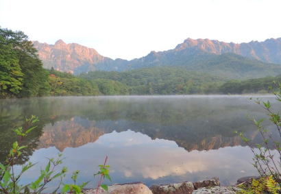朝日に照らされた山々が池に写り写真が撮れました。 |