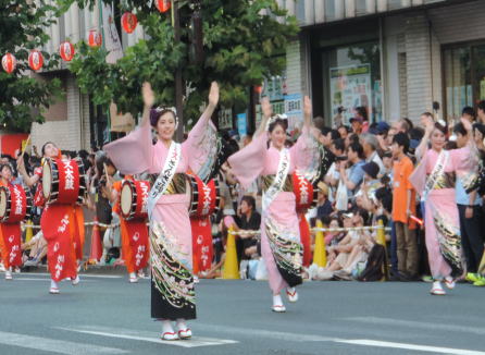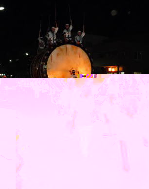 1000人を超える太鼓奏者、踊りてが道路を練り歩きます。多くの太鼓の音がとどろき、それに笛の音色、色華やかな衣装付けた踊り子たちが |