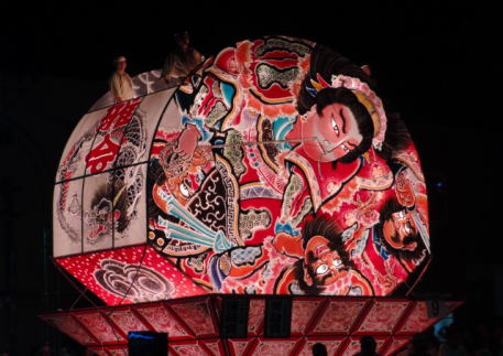大型で迫力ある山車(ねぶた)は、高さ5mにもなります。すべてねぶた師と呼ばれる職人の手作りでできています。 |