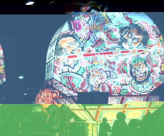 立佞武多の歌とともに始まりました。巨大ねぷたは大勢の人々によっては引かれていきます。笛や太鼓 |