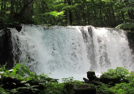 銚子大滝散策、幅約20m、落差約7m、水が多く素晴らしい流れ、飛び散る滝のしぶき、降り注ぐ木漏れ日を浴びながら、 |