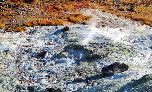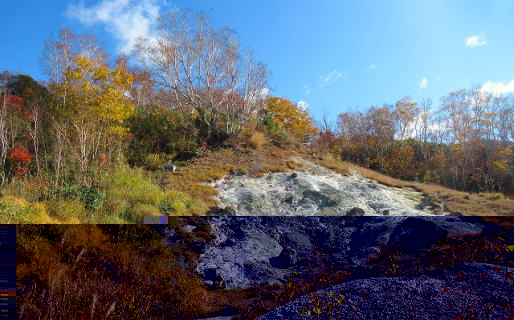 城ヶ倉に向かう途中、目を見張る紅葉がありました。後生掛温泉です。温泉の源泉になっているという噴泥が吹き出しておりました。 |