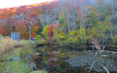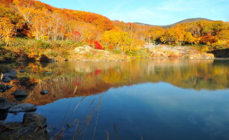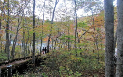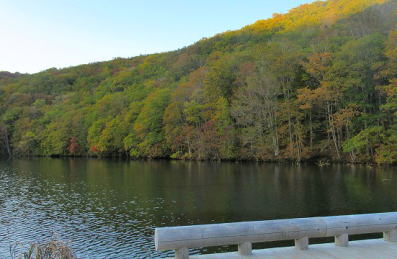 水面の色を変化させるそうです。冬は氷点下30度でも凍らないそうです。傍には展望台があり紅葉に囲まれた沼が一望できます。 |