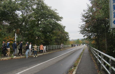 松川渓谷に架かる森の大橋まで来ると道路の脇に停めてある車の多さに気が付きました。紅葉のベストポイント、大橋の上には大勢の人々が |