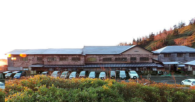 標高1400m、東北一高所にある秘湯の宿 藤吉温泉 彩雲荘に到着です。もう何台かの車が到着していました。 |