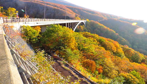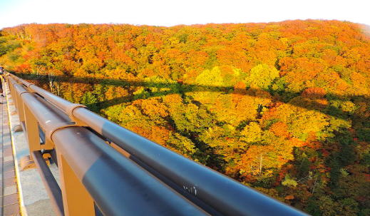 全長300mの上路式アーチ橋で日本一長いものです。橋の上からのパノラマの眺めは圧巻の一言、眼下は渓谷になっていて122mあり美しい眺めです。 |