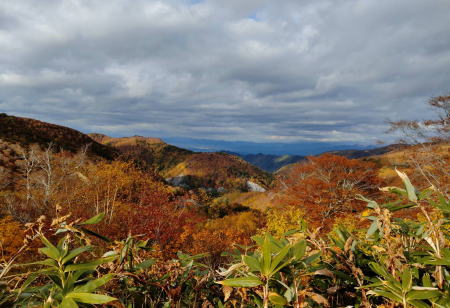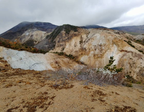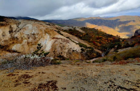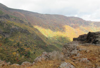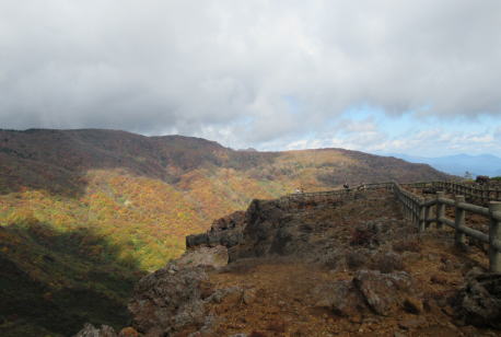| 一望する蔵王の火山100万年前から続いています。白色の変色した溶岩に驚きました。 |