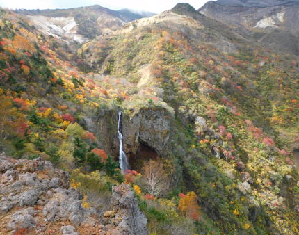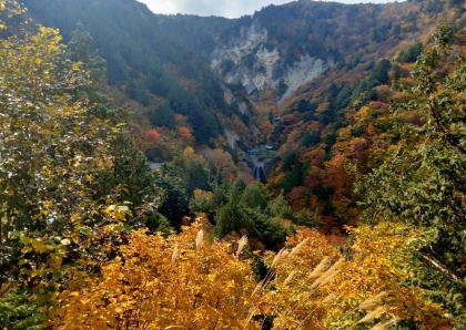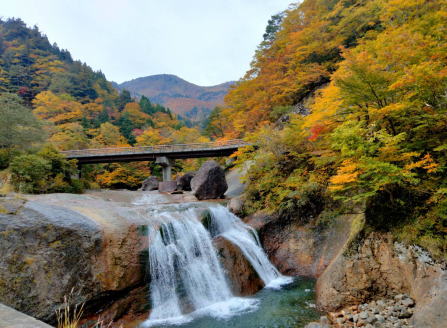 | 三階滝、不動滝、地蔵滝とそれぞれの風情の異なる3つの名瀑を一度に眺めるブュースポット 落差181m、巾7m、ブナやカツラの林の中を |