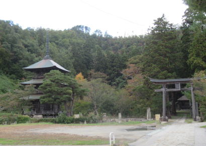 | 生い茂る樹木に囲まれた苔むす石畳み参道の入り口を入りますと、端麗な姿の三重塔、舞楽殿、その奥に本殿があります。 |