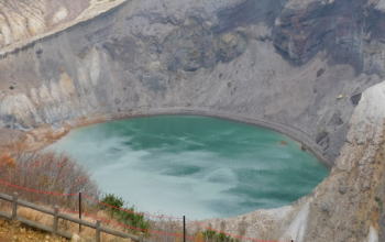 | 火山の噴火で誕生した火口湖、太陽の当たり方で色を変える神秘的な湖面は天空に輝くエメラルドグリーンです。 |
