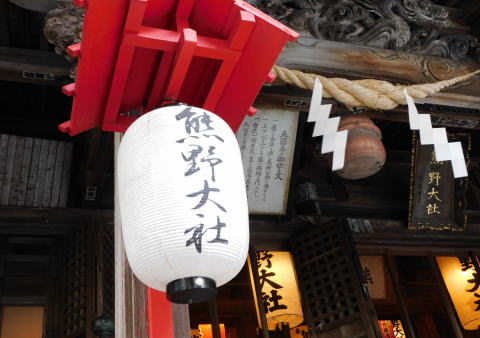 日本三熊野のひとつとに数えられる由緒ある神社、再建は806年と伝えられる。重厚な茅葺き屋根の拝殿は堂々として