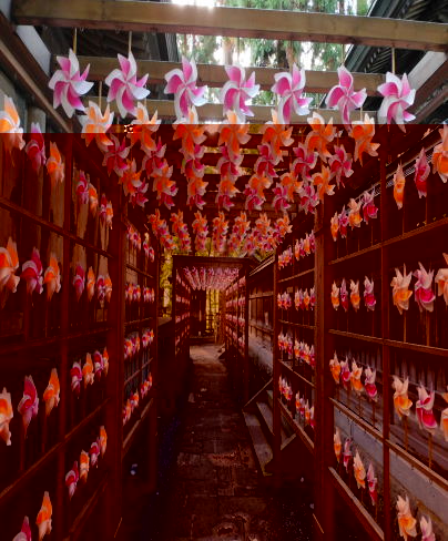 当山の始まりです。朱塗りの建物の下が洞窟になっておりまして、その洞窟を廻る参拝コースには、不動明王の弟子36童子が祀られております。