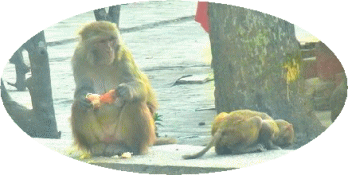 町の中を車で走っていますと大きな曼荼羅が書かれた場所がありました。さるも道端にたくさんいました。 |