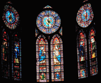 | ここに入ると一番目に3つの大きなステンドグラス見えます。北のバラ窓は美しく輝いています。 | |||