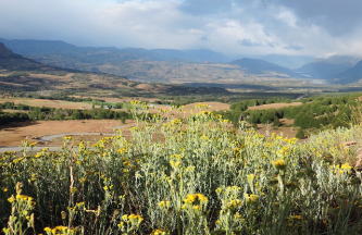 | 黄色の花セネシオ 綺麗なコバルトブルーのヘネラルカレーラ湖 | ||