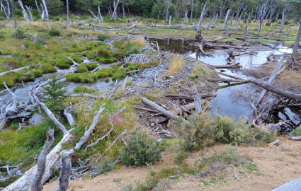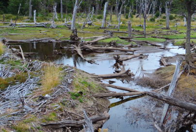 巣をつくるためにビーバーダムをつくります。(流れを止めて池のようにする)樹木は水につかり |