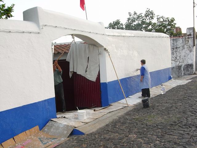 外へ出ると坂になって家並みが続いている。老夫婦が塀の壁塗りをしていた。長い棒に毛をつけて上手に塗っていた。職人を頼まなで自分で塗るのである。日本では考えられない。