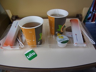 車内ではお茶のサービスがありました。暖かい紅茶をいただきました。 |