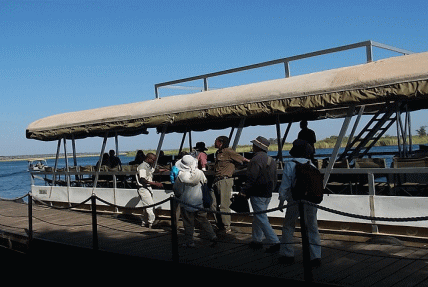 | 船長さんはモーセスさんです。ゆっくりと船は走ります。飲み物、おやつ付です。周りはチョベ国立公園です。 | |||