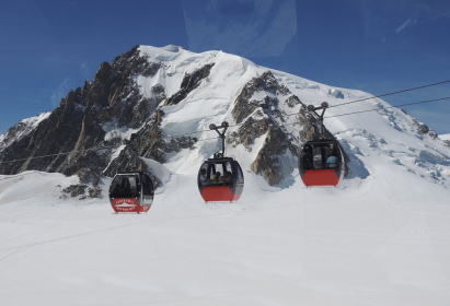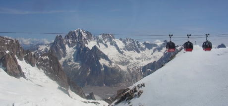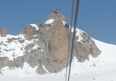 | エギュイ・デュ・ミディ 世界に誇る展望台エギュイ・デュ・ミディ3942mシャモニー針峰群の中で最も 高い展望台からの素晴らしい景観は圧巻です。 シャモニーからロープウェイで20分でエギュイ・デュ・ミディの山頂の 展望台まで行く事が出来ます. 9時過ぎにロープウェイ乗り場に着くと大勢の人が並んでいました。 すごい人にびっくりしました。ロープウェイは大勢の人が乗れますが、まだまだ人が 大勢並んでいます。 展望台に着くとモンブランをはじめとする4000m級の山々の360度 素晴らしいパノラマです。モンブランから続く稜線とそこから流れ出る ボソン氷河が見えます。 エレベターで頂上へ、テラスからはマッタンホルンやモンテローザも 見えました、他にも展望台がありそれぞれの眺望を楽しみました、 これは必ず乗るべきとと聞いてモンブラン・パノラマ・テレキャビンに 乗りました。 3つ連なっています。空中散歩です。テレキャビンはイタリアのポワント・ エルプロンネに向ってセラミック(塔状氷魂)やクレパスの上を進みます。 なんと素晴らしい景観です 他に世界に来たようです。1時間近く楽しみました |