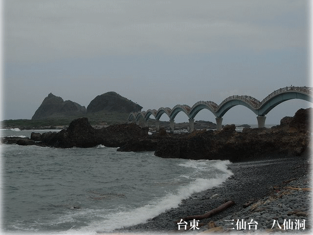 | 移動時間3時間バスに乗り、海岸線を走る。台湾地震の跡が見える。 畑が土で埋もれて跡形もない。作物はぜんぜん取れない。 これが、再び使えるようになるのか? 海は台風で薙ぎ倒された大木で砂浜が足の踏み場もないほど積みあがっている。 お金になるものだけを回収して、残りはそのままだそうだ?こらからもこのままなのか? 北京ダックを育てる所も見える。まるで雪でも散らしたようだ? 三仙台 3つの岩がくっついていたが、腐食によって崩れてしまう。今は離れているので、橋が出来たそうだ。 麦飯石が有名 ここでしか取れないそうだ。水の浄化や臭い消しに良いそうだ。 八仙洞 噴火して出来た岩山に14箇所に洞穴が腐食よって出来ている。 洞穴の中には観音様がある。 阿美族の踊りを鑑賞する。独特の衣装に身を包み楽しそうに踊る。私たちも加わり楽しく踊る。 終わりには写真を撮られ買う事になる。 |