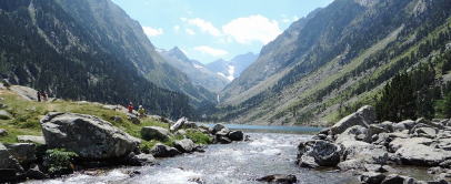 | 川のほとりの遊歩道を行くと、周囲には草原や針葉樹林。背景にある雪と氷河に覆われたピレネーの山々がとてもきれいです。 | ||